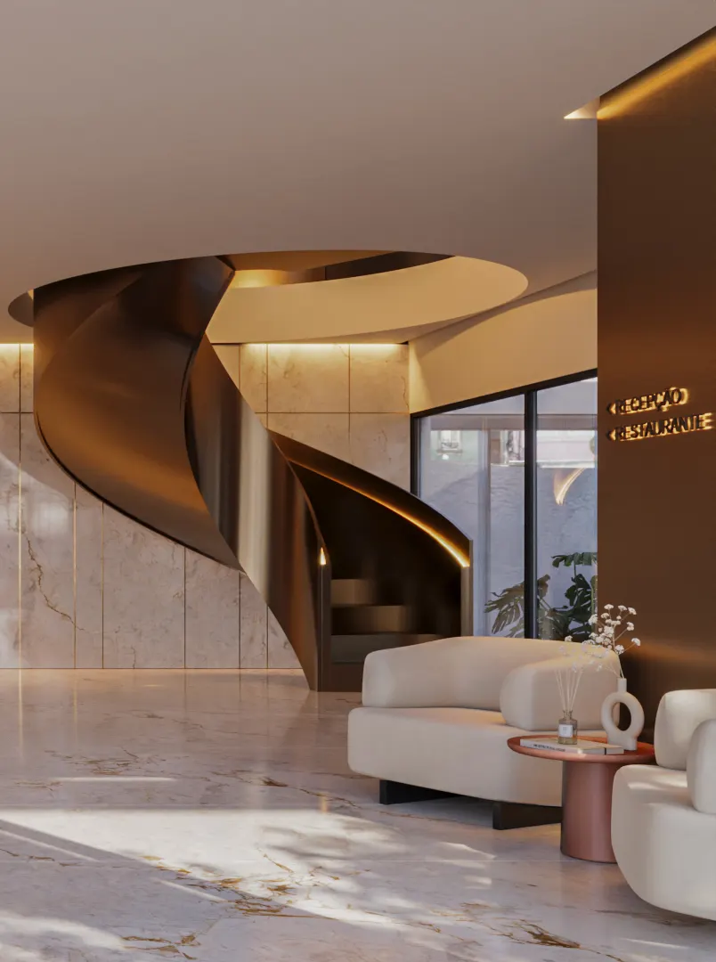 O projeto propõe um novo volume de linguagem contemporânea e minimalista, marcado pela leveza, transparência e pureza formal. A sua fachada escultórica acolhe os espaços de receção, estar e convívio, funcionando como elemento central de articulação entre os dois palácios existentes.