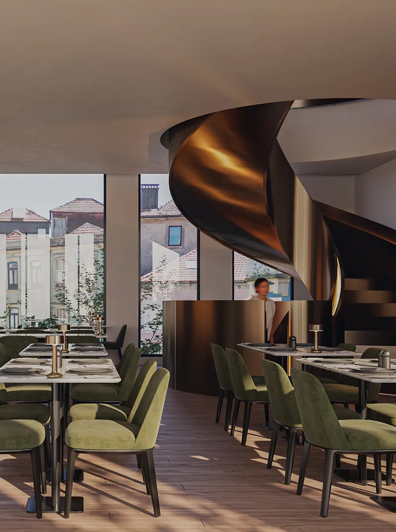 A proposta conjuga o património arquitetónico de Marques da Silva com uma linguagem contemporânea distinta, traduzindo-se numa intervenção que respeita a memória do lugar e projeta o conjunto para o futuro.