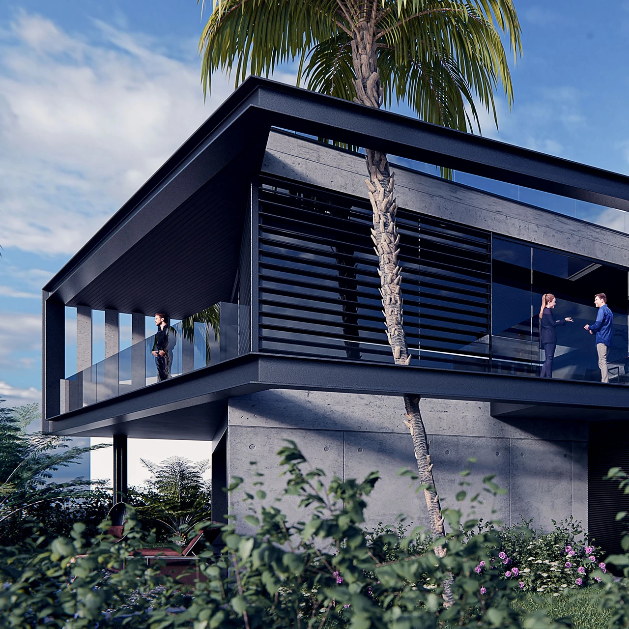 A materialidade do edifício afirma-se pela sua expressividade, recorrendo a diferentes materiais e sistemas construtivos. A estrutura combina betão armado com perfis metálicos HEB lacados a cinzento-escuro, garantindo coerência com as caixilharias. Os pavimentos exteriores alternam entre lajes de betão na entrada principal, grelhas de relva na rampa de acesso à garagem e solos vegetais no restante espaço. As varandas e terraços são revestidos com deck de madeira. A cobertura é também aproveitada como área social complementar, acessível pela sala de estar e por uma escada exterior, equipada com zona de barbecue e jacuzzi, permitindo contemplar a paisagem costeira.