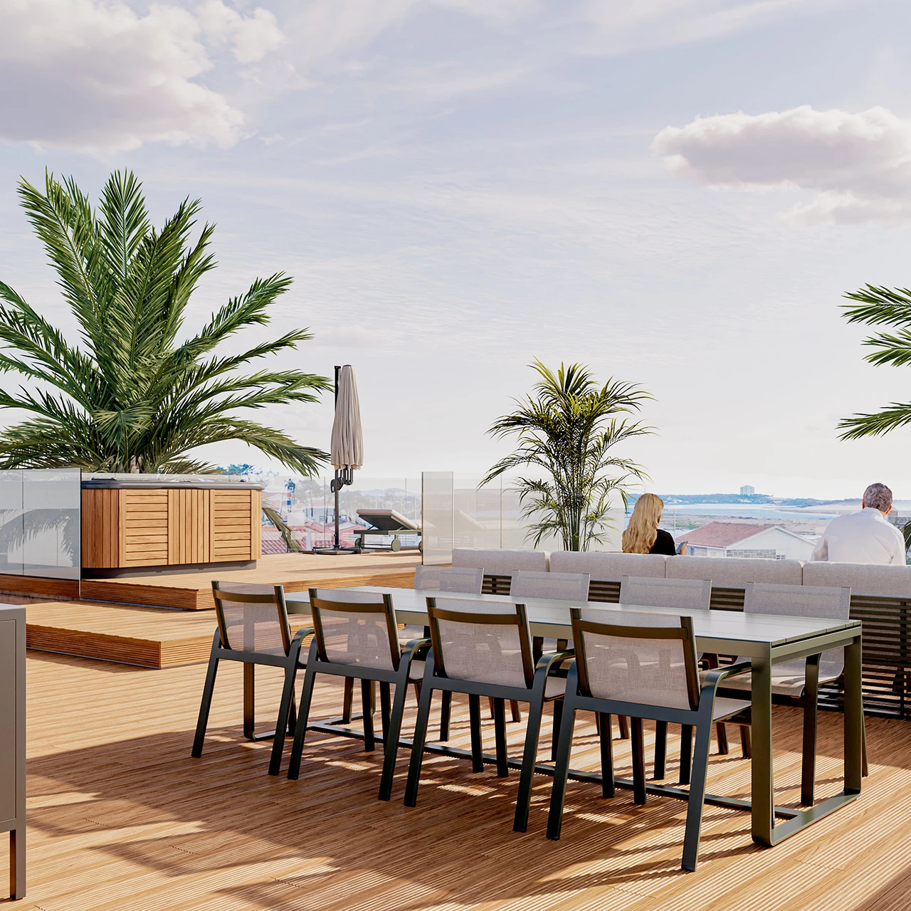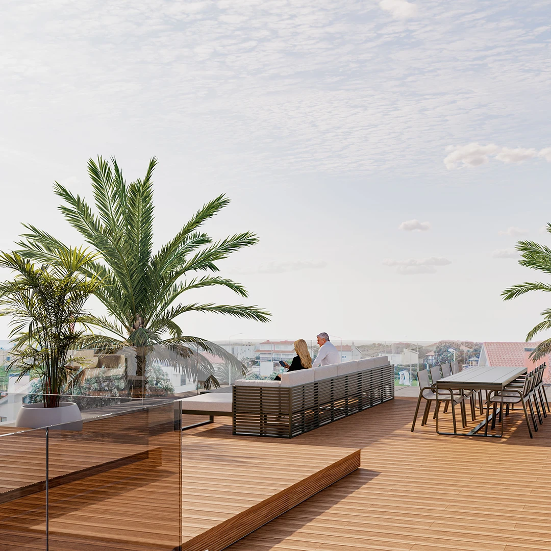 O rooftop surge como o último parágrafo desta composição — um lugar onde o céu se aproxima e o mar se torna presença absoluta. É ali que o habitar se transforma em contemplação, onde o tempo abranda e o espaço se abre a uma experiência mais íntima do lugar — acolhe o mar, a amplitude e o movimento lento da paisagem costeira.