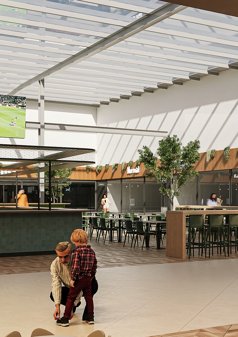 No interior, a intervenção propõe a renovação dos pavimentos e das frentes de loja, bem como a remoção de tetos falsos, permitindo a entrada abundante de luz natural. Estas alterações contribuem para um ambiente mais luminoso, arejado e energeticamente eficiente. A criação de uma nova Praça de Alimentação central, concebida como o coração do parque comercial, introduz uma área de estadia com esplanada e quiosques, promovendo uma experiência mais acolhedora e social.